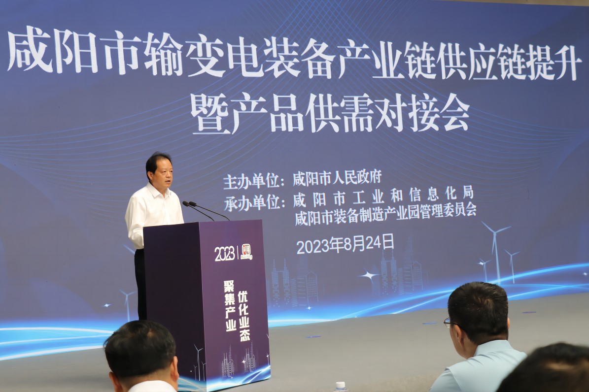 2023 年 8 月 24 日上午 09:30,由咸阳市人民政府主办、咸阳市工信局、咸阳装备制造产业园管委会协办的咸阳市输配电产业链供应链提升暨产品供需对接会如期在咸阳市装备制造园会议厅隆重举行,出席本次会议的有咸阳市副市长李忠平、市政府副秘书长吴凯、产业园管委会书记刘辉、市工信局局长李森及各区县主管工业的领导和园区重点企业代表约300余人参加,我公司作为本次输配电产业链骨干企业应邀参加了本次会议。